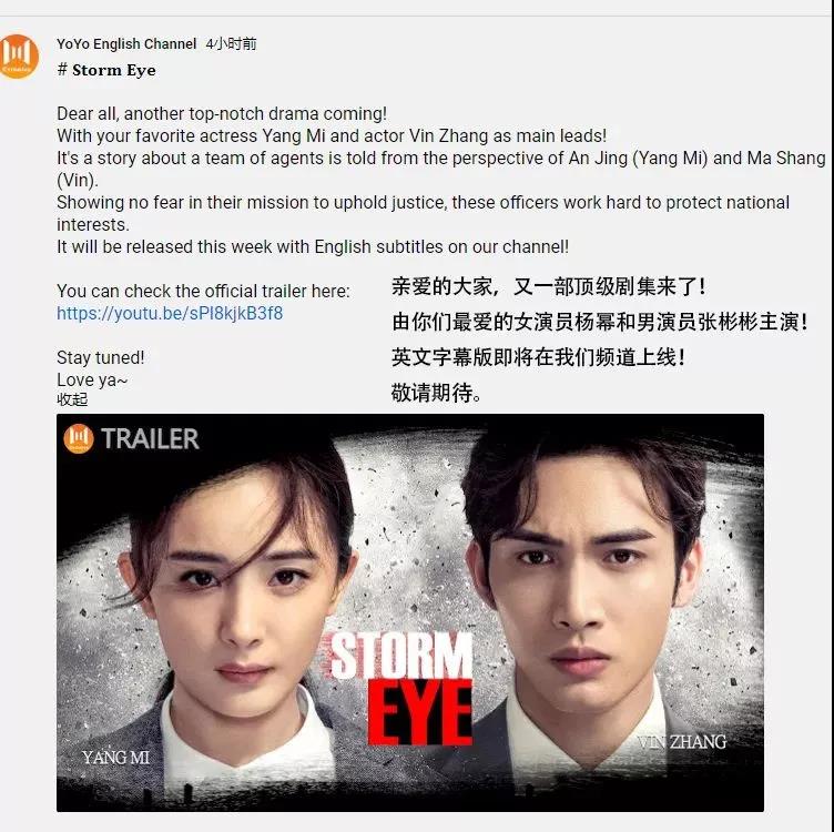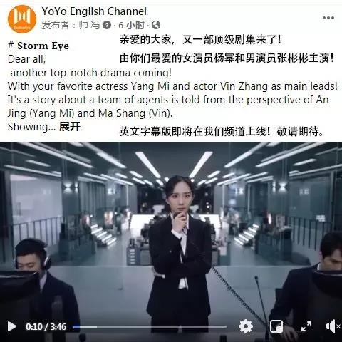 《暴风眼》讲述当代国安人员保护国家稀有资源及重要科研技术的故事,由嘉行传媒、青春你好传媒、完美世界影视出品,世纪优优独家海外发行。为提高该剧海外传播效果和影响力,世纪优优在海外14大播出平台同期上线《暴风眼》,并加强对该剧的多语种翻译和推广营销。目前,世纪优优在YouTube上的优优多语言频道已上线并翻译更新中文、英文、阿拉伯语、西班牙语、葡萄牙语、印尼语、韩语等语种,7大语种同步更新,及时满足海外用户追剧需求。同时,世纪优优还制作了10多种国际版海报,在海外社交媒体进行多渠道宣传推广。上线两周以来,该剧累计观看次数超过600万,并保持稳步上升,观看人数最多的前五个国家分别为印度、美国、菲律宾、印度尼西亚和加拿大,以年轻女性为主。