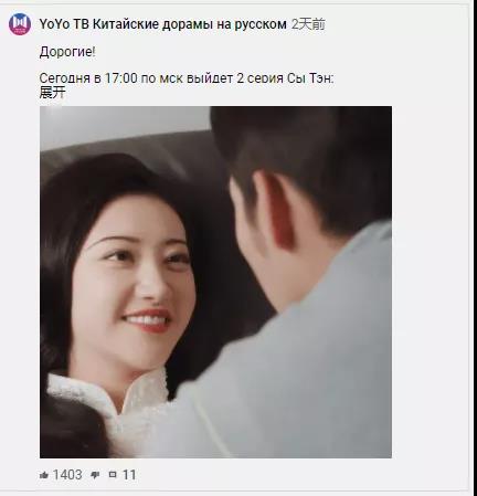 在俄语地区,俄罗斯是观看中国电视剧最多的国家,观众观看次数占该平台观看总次数的四成。在俄罗斯本土最受欢迎的社交网站平台VK上,有众多中文剧字幕组翻译中国电视剧。世纪优优俄语频道也在当地社交平台进行了常态化的剧集宣推。