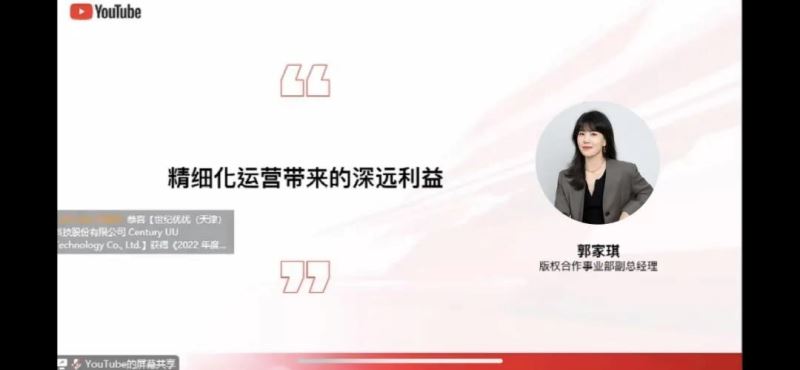 2022年12月6日,世纪优优版权合作部副总经理郭家琪(Alina Guo)出席YouTube官方在线举办一年一度的合作伙伴峰会(线上),分享了世纪优优关于“精细化运营带来的深远利益”主题演讲。郭嘉琪表示,“文化出海”是世纪优优过去10年来一直在做的事情。未来,世纪优优将携手更多国内的合作伙伴,开拓全球传统电视台和新媒体渠道,不断扩大对外贸易规模,让中国故事在海外持续传播。