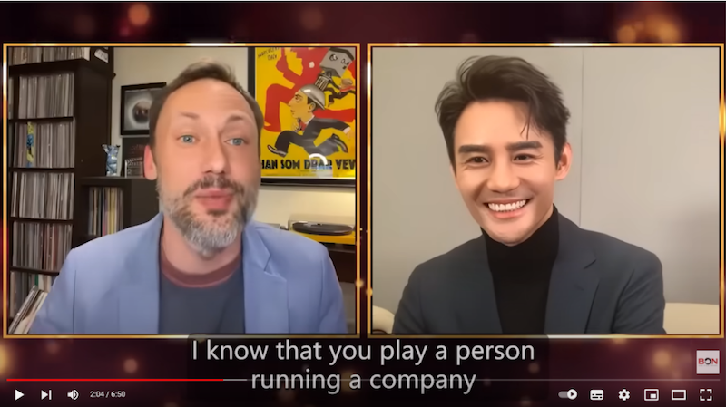 与亚历克斯对话的中方嘉宾是电视剧《大江大河2》的主演,青年演员王凯。他曾主演了《伪装者》《琅琊榜》《欢乐颂》《北平无战事》等高收视率、高口碑、高质量的电视剧。凭借《大江大河2》中“宋运辉”一角,2022年,王凯不仅获得了第13届澳门国际电视节“金莲花”奖最佳男主角,还提名了上海电视节白玉兰奖和中国电视金鹰奖的最佳男演员,成为中国新生代演员中的代表人物。