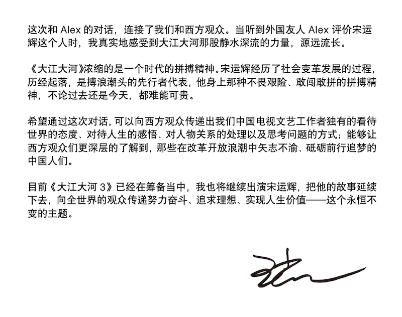 对话结束后,王凯表达了此次与亚历克斯交流的感想。他说,对话不仅可以向海外观众传递中国电视文艺工作者的创作理念与思想情感和态度,还能让更多西方观众了解矢志不渝的中国人和砥砺前行的中国故事。他将继续饰演好“宋运辉”,向世界传递奋斗、追梦、实现人生价值的永恒主题。