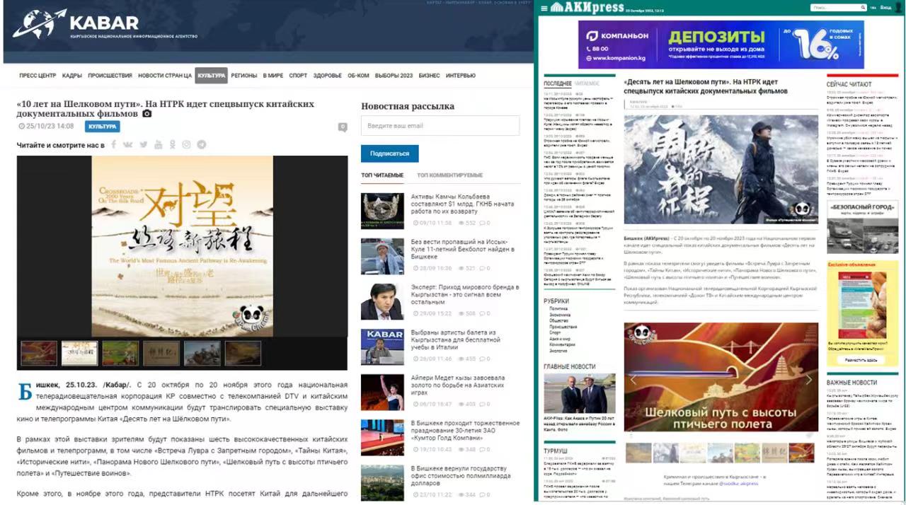10月24日,上海合作组织峰会在吉尔吉斯召开之际,由国务院新闻办公室、国家广播电视总局指导,五洲传播中心举办的《熊猫剧场》“丝路这十年”展播活动在吉尔吉斯斯坦启动。展播活动为期一个月,通过在吉国家电视台、德隆电视台等传统媒体和新媒体平台播出《“一带一路”十周年宣传片》《勇敢者的征程》《鸟瞰丝路》《对望:丝路新旅程》《当卢浮宫遇上紫禁城》等中国优秀视听节目,弘扬和平合作、开放包容、互学互鉴、互利共赢的丝路精神,讲好新时代“一带一路”友好合作故事。