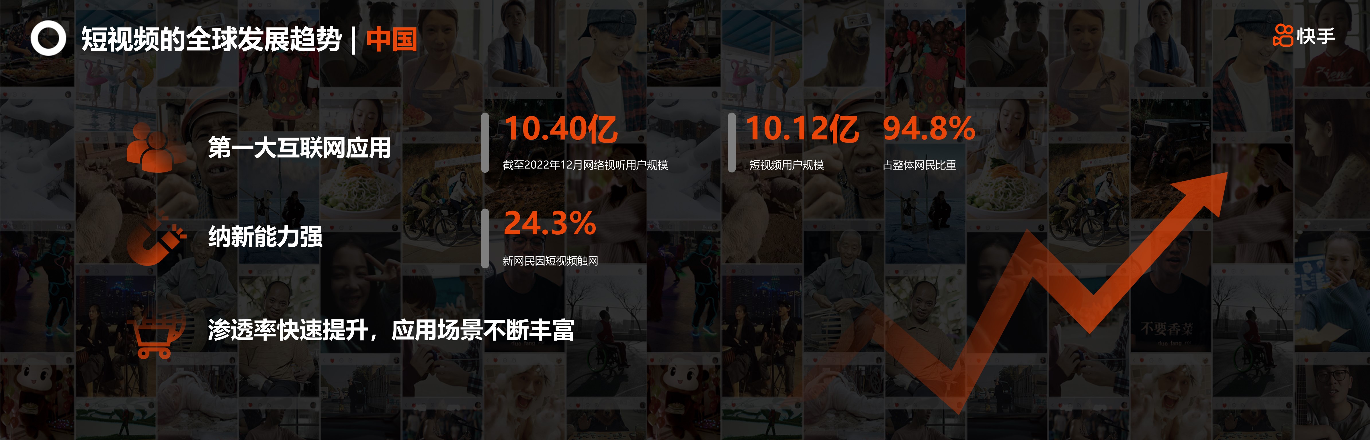 过去几年,短视频保持了高速发展势头。中国作为短视频渗透率最高、技术人才储备最丰富的国家,短视频有着坚实广泛的用户基础。根据今年3月发布的《中国网络视听发展研究报告》,截至2022年12月,我国网络视听用户规模达10.40亿,超过即时通讯10.38亿的用户数量,成为第一大互联网应用。短视频“纳新”能力远超即时通信,近四分之一新网民因短视频触网。新入网民中,24.3%首次上网使用的是短视频应用。中国短视频用户规模达10.12亿,占整体网民的94.8%。