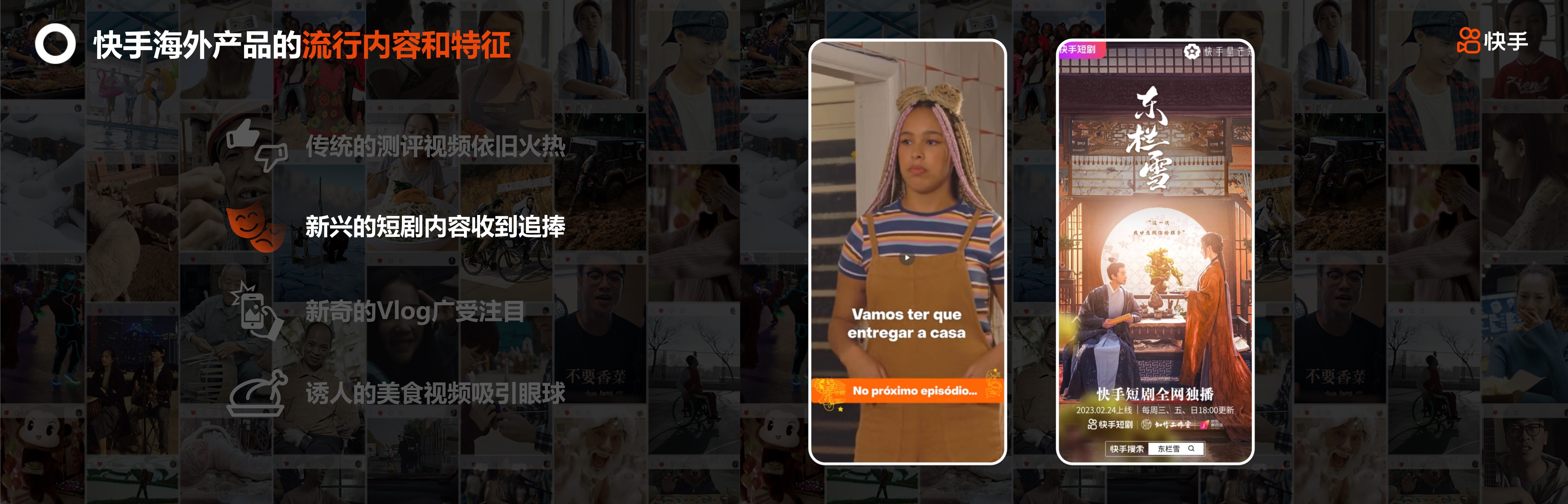 在海外,快手也推出了短剧产品TeleKwai,供海外用户制作和收看短剧。国内优秀的短剧内容被输送到海外,通过一系列简单搬运和翻译后,一些优秀短剧得以在国外播放,受到海外观众热捧??焓侄叹纭抖秆?讲述了夺嫡皇子褚宁远和冷血宫女沈颜在复仇路上互相陪伴与救赎的甜虐故事,每集时长3分钟左右,在国内播放已超过5.3亿次。经过翻译和搬运,《东栏雪》在海外上映,引起热烈反响。其他如都市类、生活类、搞笑类短视频在海外也都得到不同程度的关注。