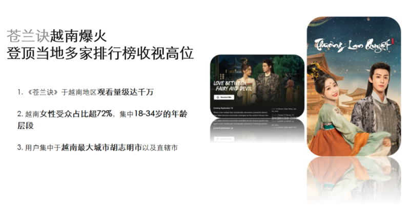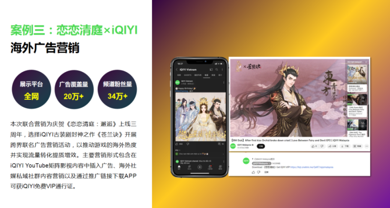 跨界联名广告营销活动,以推动游戏的海外热度。本次选择iQIYI古装剧封神之作《苍兰诀》开展,凭借在海外千万级+的影响力,实现流量转化提质增效,单词营销活动广告即可覆盖越南地区20万+。