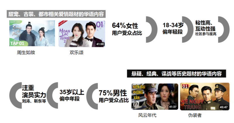 目前,古装、仙侠、甜宠、都市情感、悬疑、经典等题材的华语影视内容在越南最受欢迎,并取得了骄人的收视成绩。主要因素在于:
