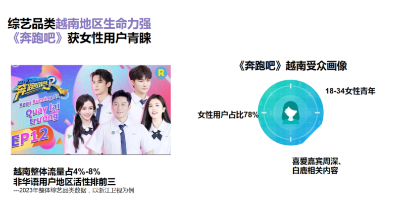 近年来,中国综艺娱乐作品制作质量显着提升,与国际接轨,广受越南地区观众喜爱。其中,《奔跑吧》在越南地区热度最高,越南市场更是成为非华语用户地区活性前三,女性用户占比78%,观众群体主要以18-34岁女性观众为主,知名艺人周深、白鹿等是越南粉丝心中最有影响力的“爱豆”?!侗寂馨伞氛饫嗷镒垡战谀慷韵附诘囊凰坎还?、精致的品控、引人的情节都增强了它们的吸引力。越南观众欣赏这些作品所展现的娱乐效果和节目品质,增强了他们的观看体验。