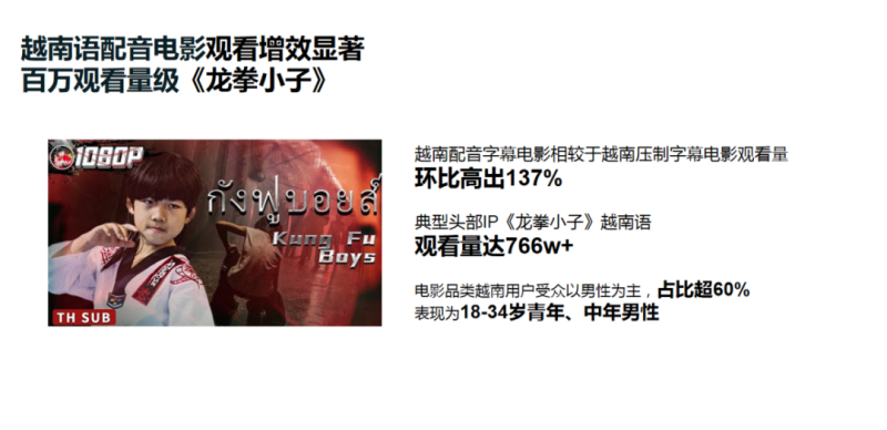 华语影视内容在越南本地化是更好与当地观众建立联系的战略举措,通过适应当地文化、语言和偏好,与越南观众建立更深层次的联系。典型头部IP《龙拳小子》越南语观看量达766w+,其背后,越南语配音和字幕的运营加持,相较于越南压制字幕电影观看量环比高出137%。在整个华语电影板块,主力群体为18-34岁青年、中年男性。在此基础上,本地化运营进程不断推进,包括内容的翻译、配音和字幕。这些步骤对于确保本地受众访问和理解内容至关重要。此外,在内容编排方面,不断调整,以更好适应当地观众的口味和喜好。华语影视内容通过融入当地主题、文化参考,甚至在一些作品中选用当地演员来实现收视成效的提升。