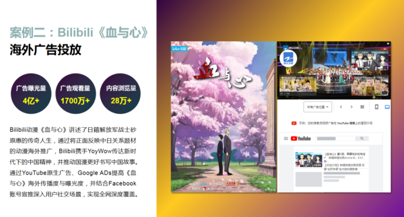针对主旋律内容专项推广。雅文传播与Bilibili携手进行《血与心》海外专题推广,双方致力传达新时代下的中国精神,并推动国漫更好书写中国故事。通过YouTube原生广告、Google ADs提高《血与心》海外传播度与曝光度,并结合Facebook账号宣推深入用户社交场景,实现全网深度覆盖。