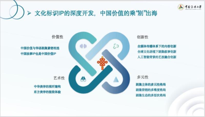 从创作层面来说,华语剧集的未来出海,重中之重是需要加强本国文化标识IP的深度开发,助推中国价值的乘“剧”出海。第一,价值性。中国价值与华语剧集紧密相连,中国故事IP也是中国价值IP。第二,创新性。这包括全媒体传播体系下的内容创新、全球文化语境下剧集叙事创新、人工智能背景的艺技融合创新。第三,艺术性。体现在中华美学的视听建构与东方美学的极致体验。第四,多元性。这包括剧集主体的多元性格局、剧集营销的多维度格局以及剧集生态的多层次格局等。