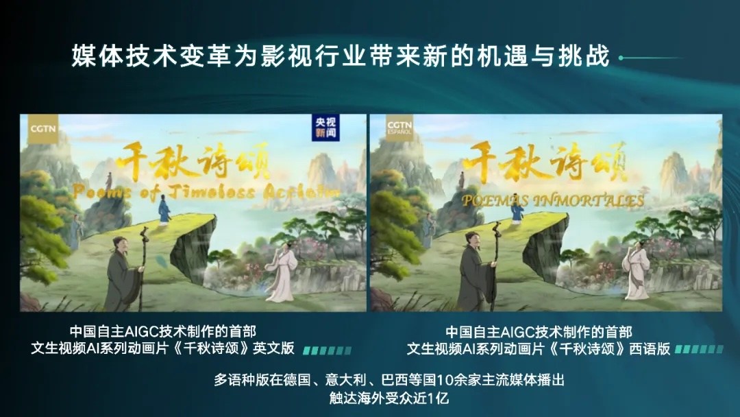 有人说,2024年将是人工智能应用大发展的“元年”。一个月前,Sora文生视频诞生,引起了业界广泛关注。仅十天后,中央广播电视总台就推出了中国自主AIGC技术制作的首部文生视频AI系列动画片《千秋诗颂》,首播六集节目收视率高居全国上星动画片榜首,累计触达观众9441.3万人次?!肚锸獭范嘤镏职嬖诘鹿?、意大利、巴西等国10余家主流媒体播出,触达海外受众近1亿。由此可以看出,媒体技术变革正在为影视行业带来新的机遇与挑战。