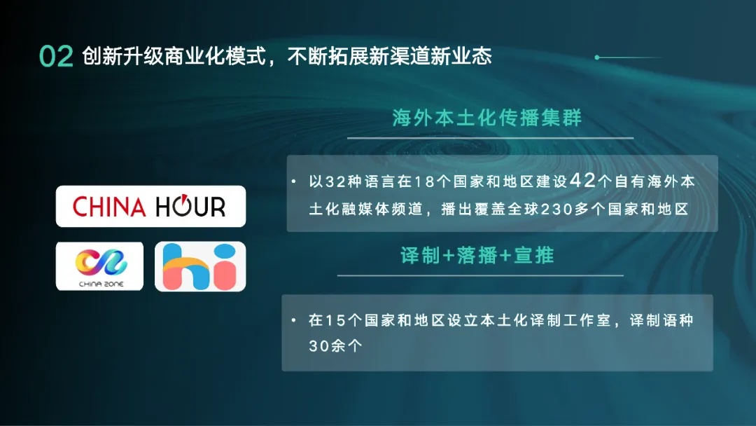 一直以来,总公司坚持商业化特色,推动外宣工作提质升级。自2015年开始在海外搭建本土化传播集群,以32种语言在18个国家和地区建设42个自有海外本土化融媒体频道,播出内容覆盖全球230多个国家和地区;在15个国家和地区设立本土化译制工作室,译制语种30余个,并创造性孵化“译制+落播+宣推”一站式、一体化商业合作新模式。