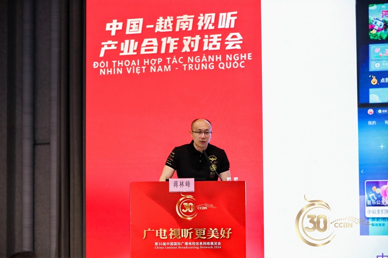 南宁峰值文化传播有限公司总经理蒋林峰以《网络视听全产品线与越南少儿产品业态的融合》为题进行了分享。他认为,文化产品应该多渠道传播,扩大用户触点,满足网络视听全产品线用户,促进越南少儿产品业态融合。