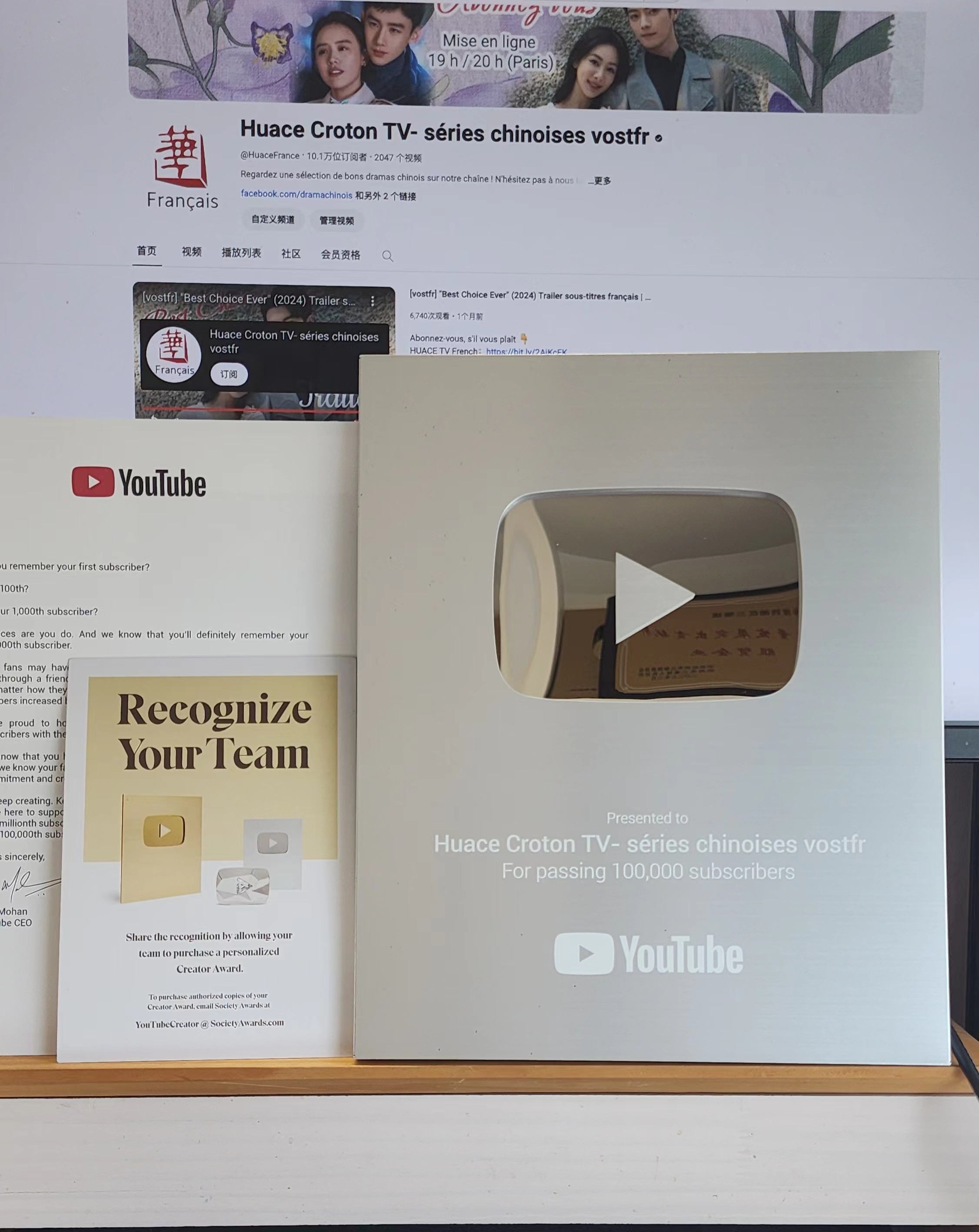 值此中法合作新时代开启之际,华策影视集团YouTube法语频道用户订阅数超10万,收到YouTube平台官方颁发的银质奖章。