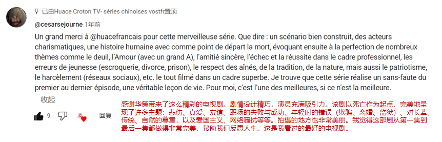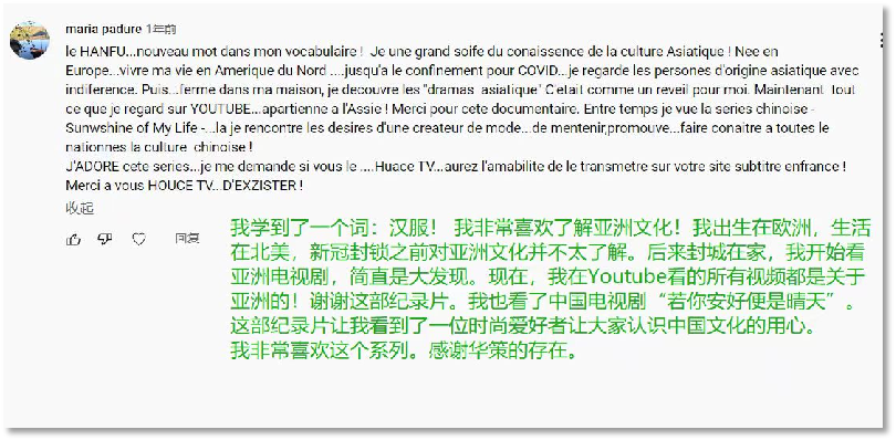 法语频道上线的纪录片也深受当地观众喜爱?!读瞬黄鸬慕橙恕?020年在华策YouTube法语频道上线后,这部以聚焦东方美学为主的匠心纪录片展示次数达到36万次,并收获大量走心好评。海外观众称赞该剧“一部关于手工艺的精彩纪录片”“我学到了一个词:汉服!”“我永远爱中国的电视剧!”