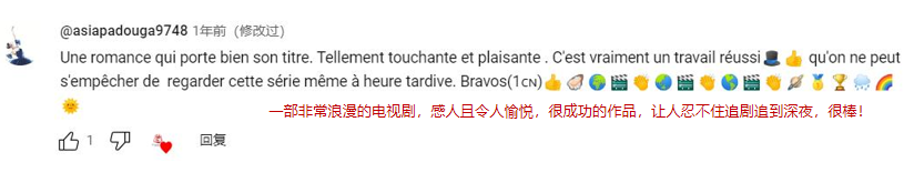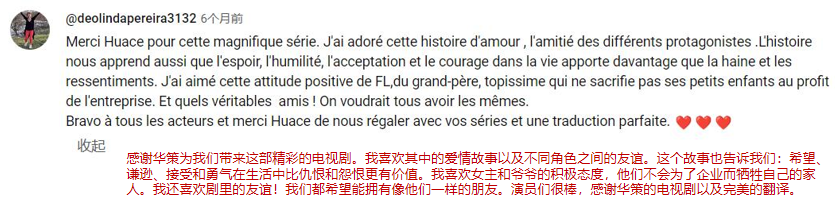都市生活和情感类现实题材剧深受法语用户欢迎,最受欢迎剧集包括《去有风的地方》《三分野》《两个人的小森林》等。法语观众评价《去有风的地方》:“感谢华策带来了这么精彩的电视剧。剧情设计精巧,演员充满吸引力……这是我看过的最好的电视剧?!逼兰邸度忠啊罚骸拔蚁不镀渲械陌楣适乱约安煌巧涞挠岩辍U飧龉适乱哺嫠呶颐牵合M?、谦逊、接受和勇气在生活中比仇恨和怨恨更有价值?!逼兰邸读礁鋈说男∩帧罚骸耙徊糠浅@寺牡缡泳纭萌巳滩蛔∽肪绲缴钜梗馨??!敝髁骷壑堤獠木纭锻饨环缭啤泛汀段颐钦馐辍吩诜ㄓ锲档郎舷吆?,均获观众好评。