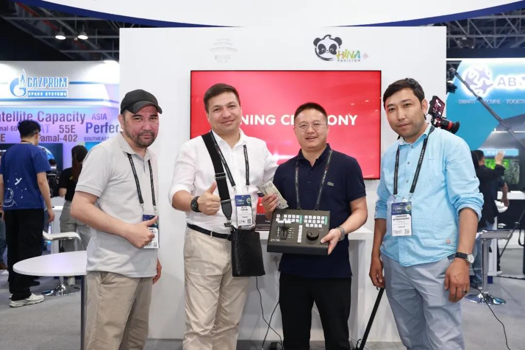 展会期间,“中国联合展台”助力中国参展企业国际化推广,与中国卫通、深圳高斯贝尔、成都迅翼卫通、惠州伟乐科技等多家企业联动,多维拓域,互荐客户,为中国视听产业链“大”出海打下了坚实的基础。成都讯翼卫通作为一站式卫星通信终端和天线提供商,重点展出了自主研发的0.35米口径自动便携终端,将卫星通信中的天线系统、射频单元、伺服系统等必要组件集成为一体,通过Ku频段高通量卫星,实现应急通信对音视频传输需求,受到现场观众广泛关注。