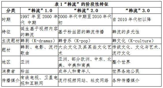 “韩流”虽然不是韩国政府的发明,但却是韩国政府文化工业政策的结果。自20世纪90年代开始,韩国政府开始推动媒介产业的发展,1995年国会颁布了促进电影业发展的新法,于1999年又颁布推进文化产业政策的法律。随着韩剧在中国和东南亚的成功,由此衍生而来音乐、时尚、饮食等成了韩国政府传播文化软实力的重要手段。仅2001年韩剧占韩国流行文化产品出口的64.3%,另外在2004年韩流还给韩国贡献了64%的外国游客,鉴于此,肥皂剧很快被韩国政府纳入韩国文化“走出去”的战略之中。于是,韩国政府、娱乐集团和企业的结盟把“韩流”整合到韩国的文化外交中并置于中心地位,而且政府开始领导这个过程,让韩国文化作为一种出口工业,走向世界?!昂鳌背晌酝及炎约汗夜菇ǔ梢桓觥俺渎盍痛葱隆毙蜗蠡疃淖槌刹糠帧8?022年版的《韩国地理杂志2019》,“韩流”的发展及其向全球的扩散被规划为三个阶段:“韩流”1.0、“韩流”2.0和“韩流”3.0,其总体特征体现为以韩剧为初始载体,从共享的文化圈出发,借助不断更新的传播技术,把“韩流”文化输出到全世界。具体规划如下表1所示。从“韩流”在全世界广泛传播的现实来看,韩国的文化“走出去”是成功的,尤其是在以肥皂剧为重要娱乐与出口产品且在语言和文化存在巨大差异的拉美。