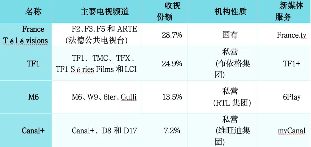 法国头部电视机构包括法国国家电视集团(France Télévisions)、法国电视一台(TF1,隶属于布依格集团)、法国电视六台(TV6/M6,隶属于RTL集团)和凯勒普拉斯电视台(Canal+,隶属于维旺迪集团)。其中,法国国家电视集团为公共服务广播电视机构,在2022年取消了电视牌照费,其收视份额排名第一,接近30%(见表1)。TF1和M6从2021年5月开始合并,但由于反垄断要求,2022年9月放弃合并计划。Canal+集团为台网一体运营模式,拥有电视台和卫星电视网。法国头部电视台均开展网络视听业务,取得良好效果。