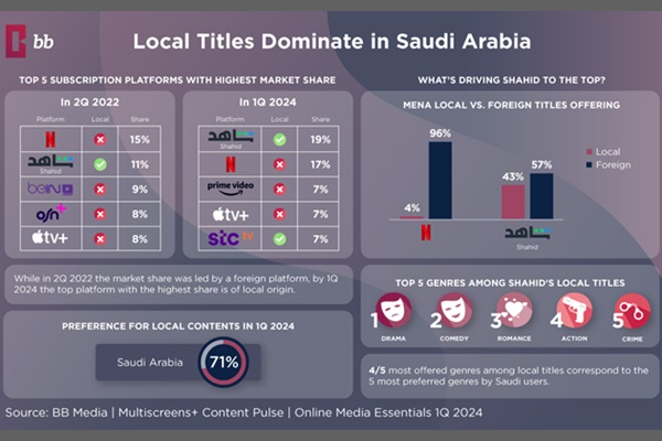 沙特阿拉伯的流媒体偏好正在发生重大转变,在2024年第一季度,71%的在线媒体消费者表示观看过本地制作的内容。对本地节目日益增长的需求正在重塑流媒体市场,并改变着平台的市场份额。