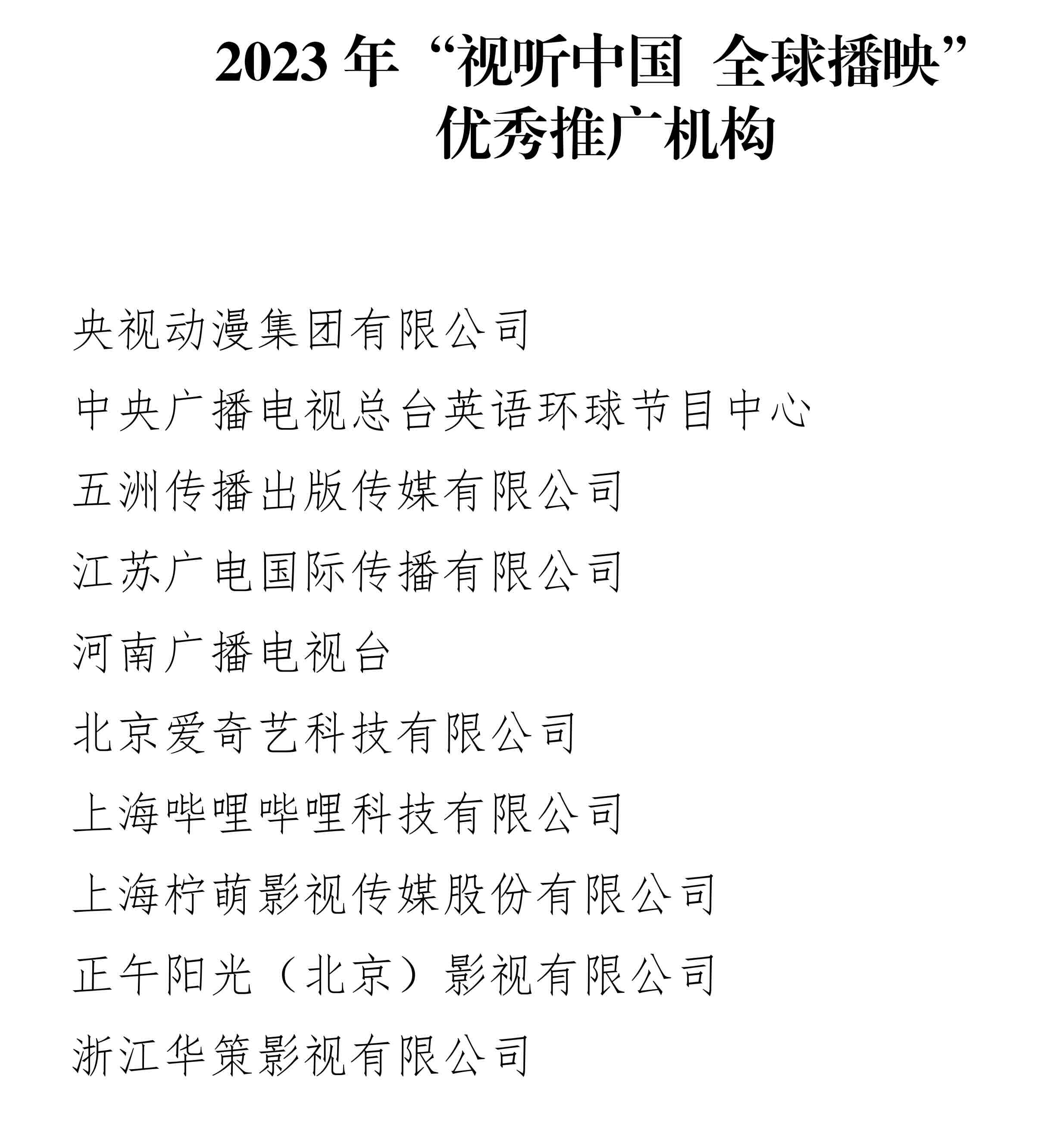 2023年“视听中国 全球播映”优秀作品、入围作品和优秀推广机构评选结果于10月11日在中国广播电视精品创作大会开幕式暨主论坛发布。中央宣传部分管日常工作的副部长胡和平同志,中央宣传部副部长,国家广播电视总局党组书记、局长曹淑敏同志为获评优秀的作品和机构代表颁发证书。