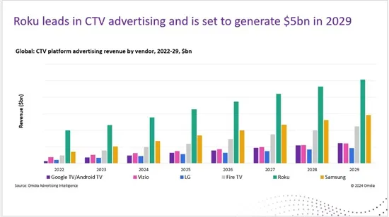 英国Omdia公司研究显示,Roku主导联网电视广告市场 预计2029年将达50亿美元规模