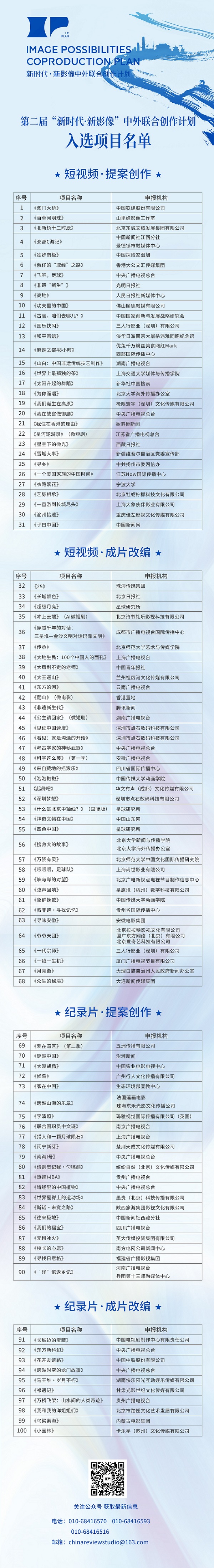 近日,第二届“新时代·新影像”中外联合创作计划完成评选工作,共评出影视项目100个。其中,短视频项目68个,纪录片项目32个。