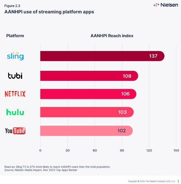 在智能手机上,亚裔观众比其他群体更频繁使用流媒体平台软件,尤其是广告支持的流媒体平台。平均每个月,YouTube的移动应用软件会覆盖85%的美国亚裔成人用户。网络电视流媒体服务的Sling TV也特别受欢迎,因为它提供大量国际电视内容,尤其是南亚和东亚语言的节目。美国亚裔观众使用Sling TV应用程序的概率比总人口高出37%。