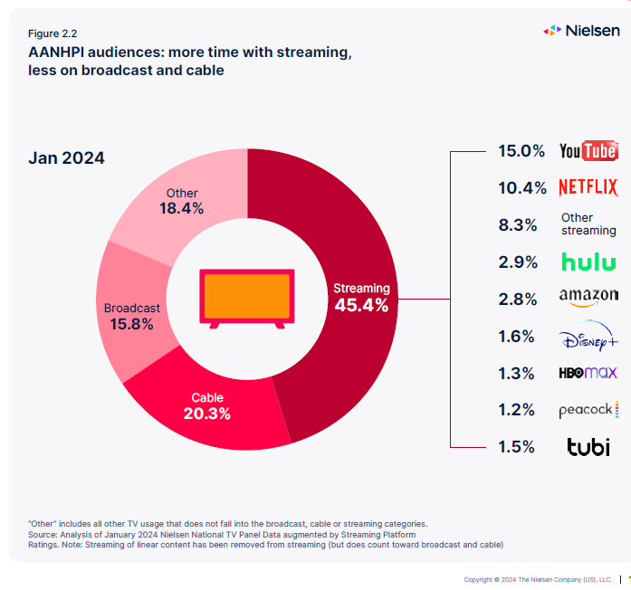 美国亚裔观众绝大多数时间花在了流媒体平台上,远超广播和有线电视。流媒体的使用比例持续增长,今年初已达到亚裔美国人电视观看时长的45.4%(相比2023年1月的43%)。相比之下,根据尼尔森《测量仪(The Gauge)》报告,流媒体在美国总人口中占据36%的电视使用时间。