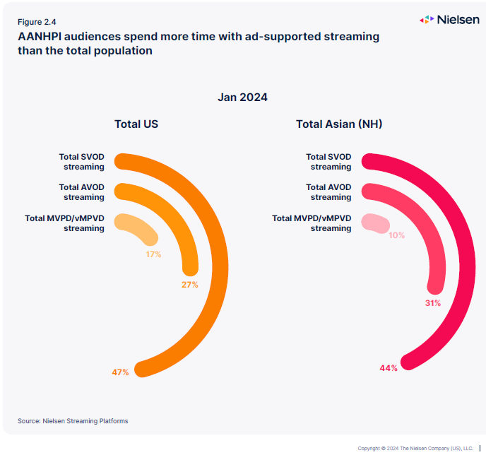 图2.4 美国总人口中,亚裔观众看带广告的流媒体时间更多