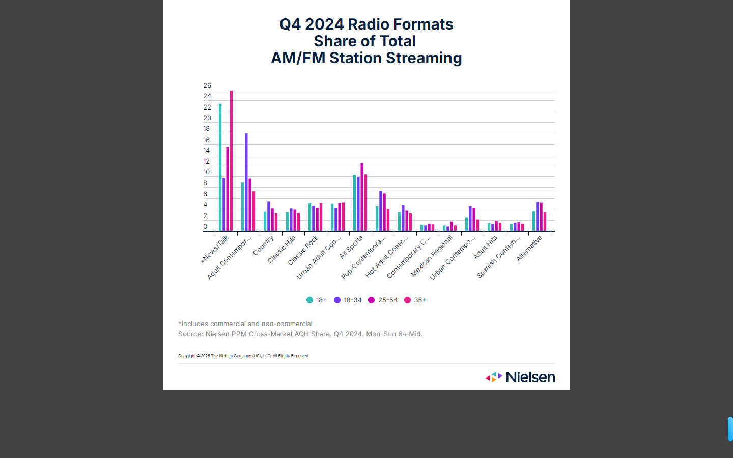 另一个年度行为变化是,当许多电台在圣诞节前转为"圣诞"音乐类节目时,成人时代(AC)类节目的收听率显著增加。从2024年第三季度到第四季度,成人时代类节目在18岁及以上成人中的收听率增长了9%,在18-34岁成人中的收听率增长了 17%。
