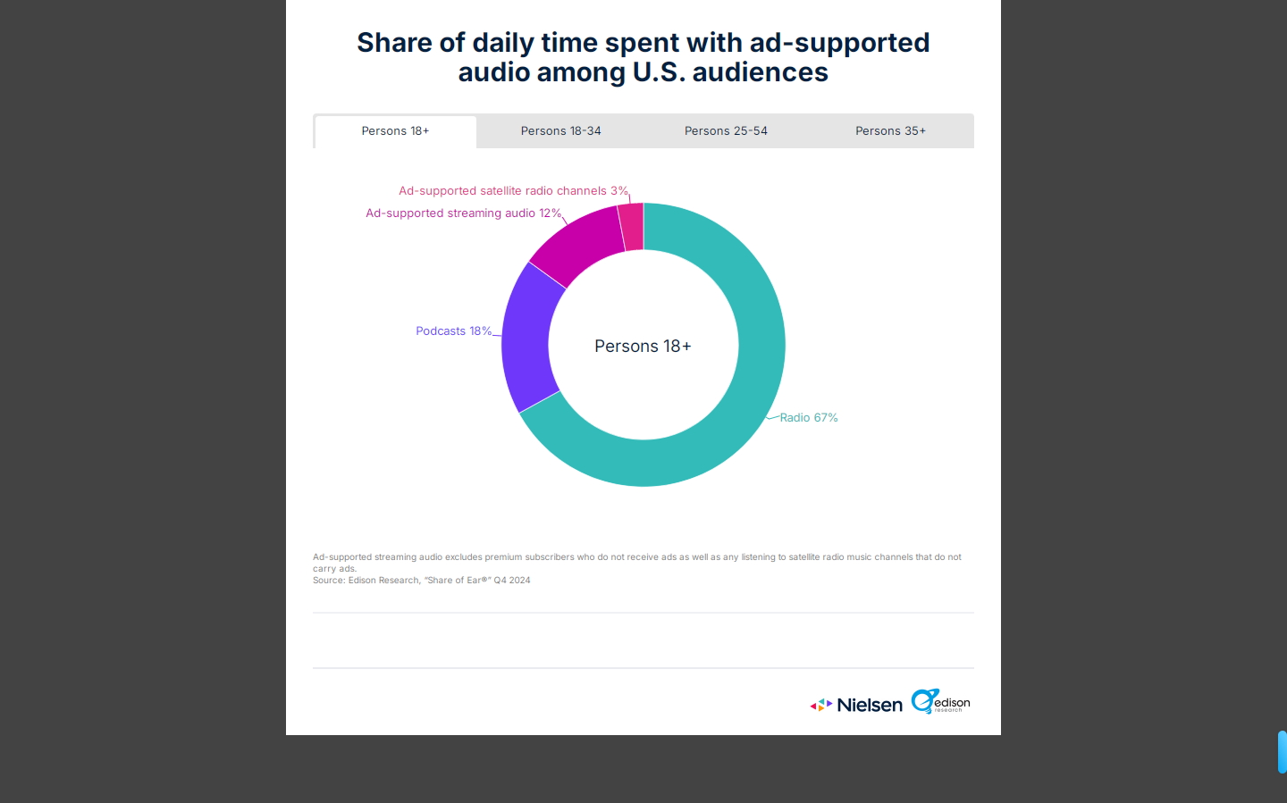 2024 年第四季度(10月至12月)期间,听众每天花在有广告的音频广播上的时间占 67%,播客占18%,流媒体音频服务占12%,卫星广播占3%。这些数据与上一季度几乎相同,只有流媒体音频服务仅增加了 1%。这说明美国听众对日常音频的需求始终如一。