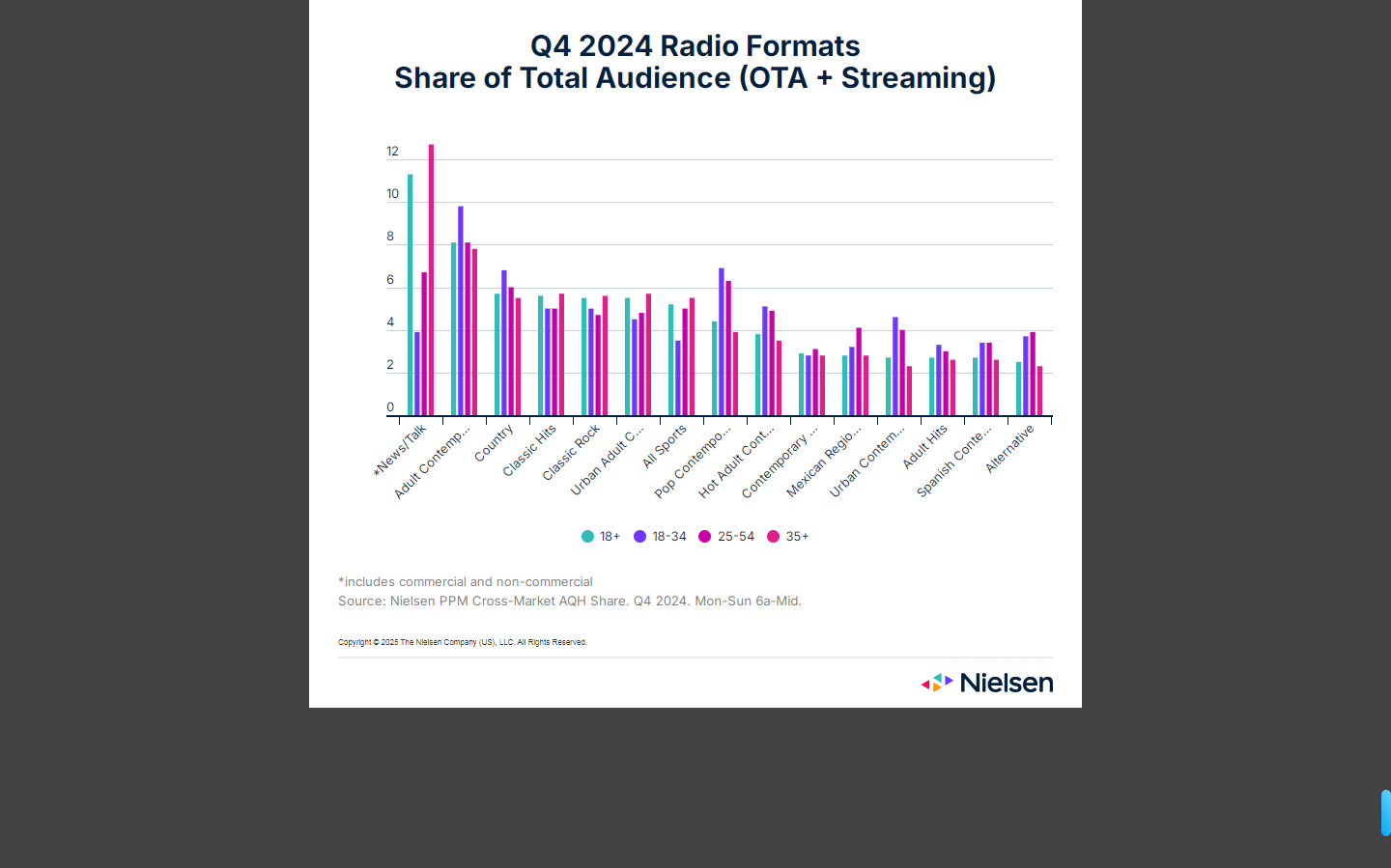 与尼尔森《数据统计》(The Gauge)所显示的2024年最后几个月的收视趋势类似,新闻和体育节目的收听率都有所上升,这一点也不奇怪。围绕每四年一次的全国大选以及每年一次的美国职业棒球大联盟季后赛和全美橄榄球大联盟赛季都会使我们对体育类谈话节目的兴趣开足马力,达到顶峰。