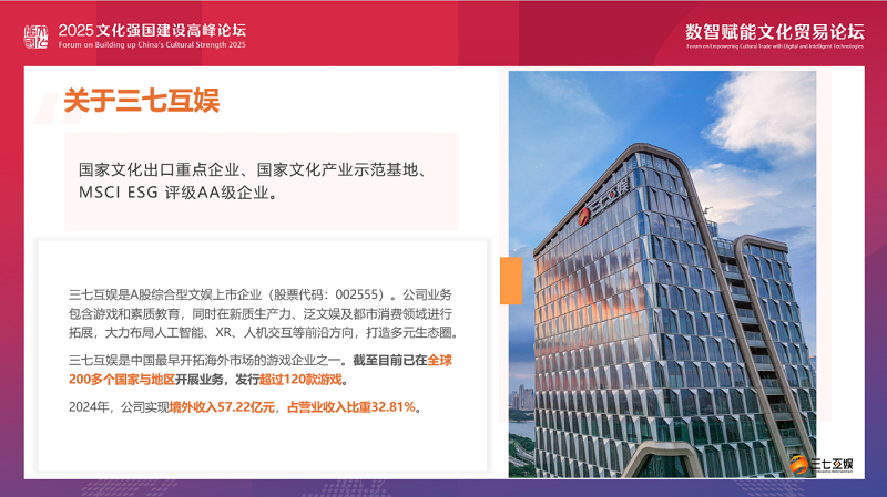 中国文化贸易正经历从 “实体输出” 到 “数字赋能” 的转型。未来,三七互娱将继续以“研运一体、IP生态、科技赋能”为核心,推动游戏与文化的深度融合,助力中华优秀传统文化的全球传播。同时,依托AI、大数据等技术,构建智能化游戏生态,提升研发与运营效率,为玩家创造更具沉浸感与互动性的游戏体验。