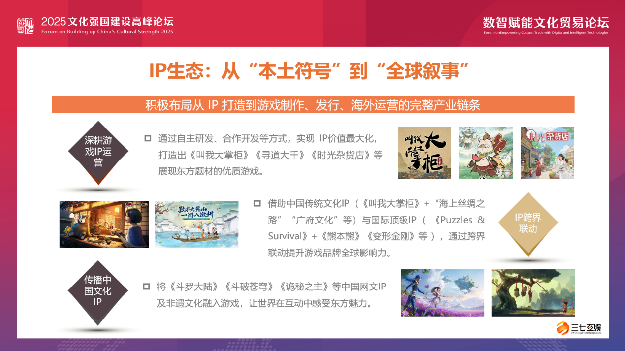 一方面,深耕游戏IP运营,通过自主研发、合作开发等方式,打造出《叫我大掌柜》《寻道大千》等展现东方题材的优质游戏,实现 IP价值最大化;另一方面,借助中国传统文化IP与国际顶级IP,通过跨界联动提升游戏品牌全球影响力;更重要的是,我们肩负文化传播使命,将《斗罗大陆》《斗破苍穹》《诡秘之主》等中国网文IP及非遗文化IP融入游戏,让世界在互动中感受东方魅力,实现从“本土符号”到“全球叙事”的转变。目前,三七互娱已储备多个头部IP游戏改编权,不断挖掘优质IP价值,为公司构建多元化产品矩阵提供更丰富的内容支撑。