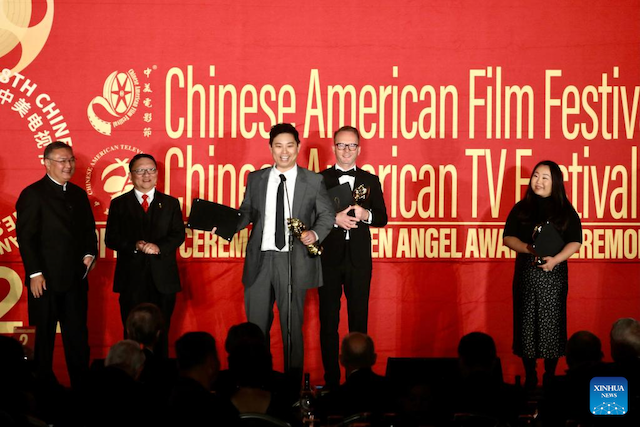 One of the honorees addresses the awarding ceremony at the 18th Chinese American Film Festival and the Chinese American Television Festival in Los Angeles, California, the United States, Nov. 4, 2022. (Xinhua)