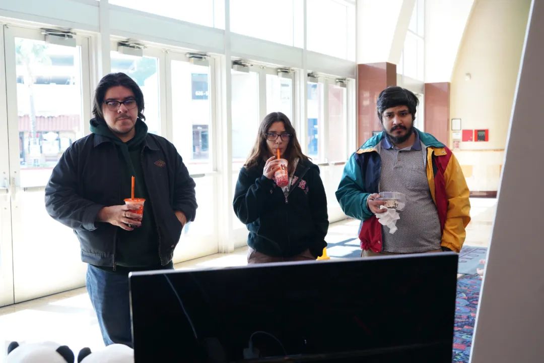 影院的工作人员兴致勃勃的现场学习中国书法,感受新春气氛。