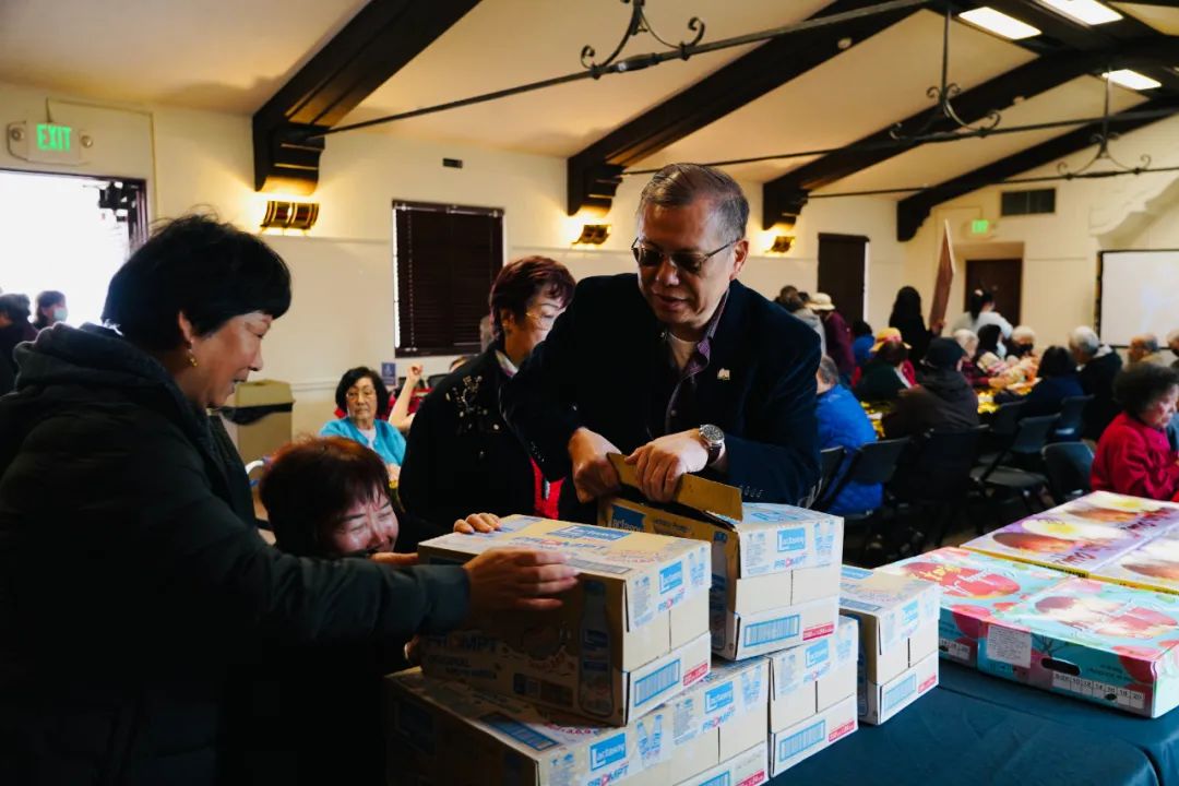 圣盖博市市议员、圣盖博希望狮子会会长丁言愉亲自为民众派发新春礼物