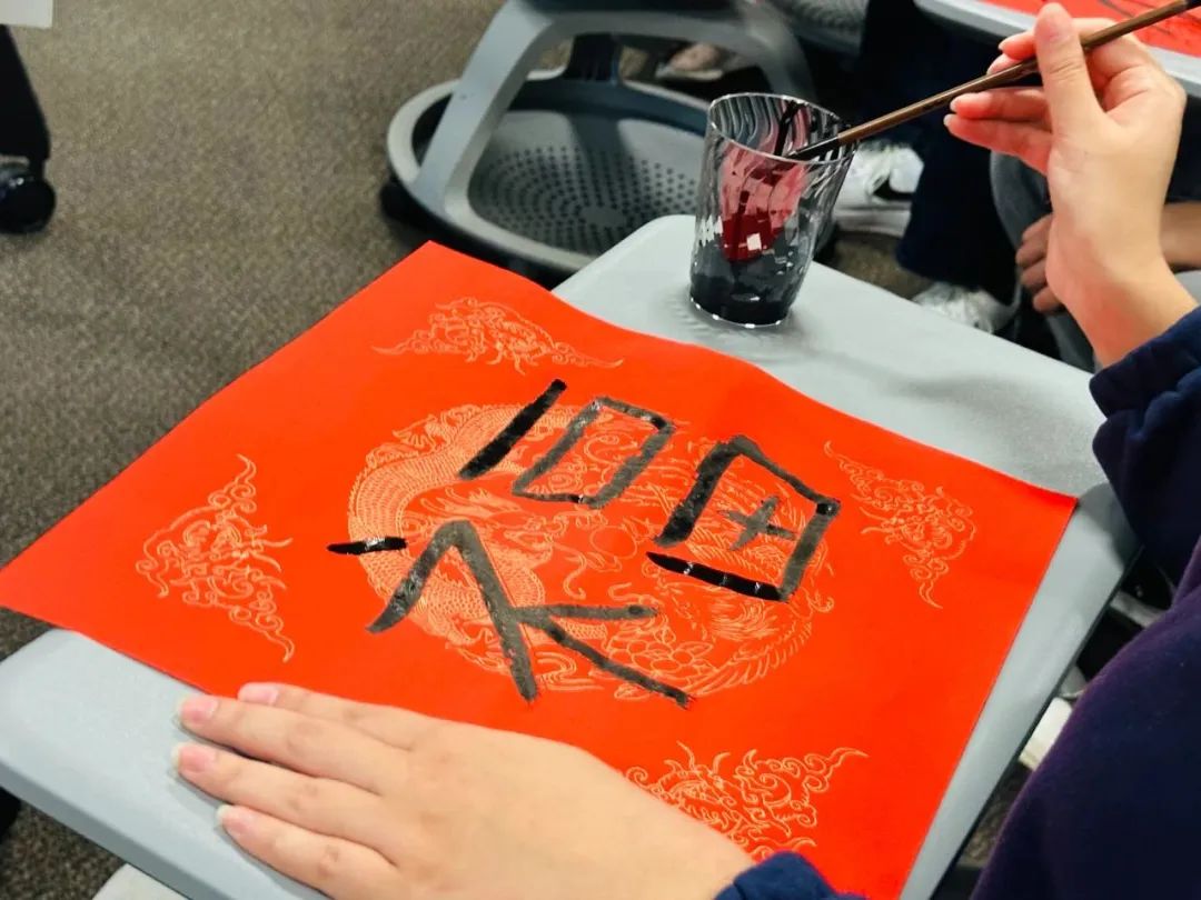 学生们在观看完短片后,也纷纷拿起毛笔认真的学习写“?!弊帧K淙缓芏嗝拦堑谝淮问樾春鹤?,更是第一次使用毛笔,但是大家都饱含浓厚的兴趣并且非常投入,完成的“?!弊肿髌芬彩强扇傻悖呛芸目梢酝ü庵痔厥獾姆绞嚼锤惺苤泄航诘钠?,也可以通过书写中国汉字这种特别的方式给亲友们送上浓浓的春节祝福。