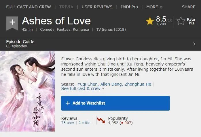“我最近才刚开始看中国的奇幻电视剧,然后我马上就着迷了。这不是我看的第一部,但在场景、服装、特效、打戏以及表演方面都绝对是最好的一部。”在美国最大的互联网电影资料库IMDb上,有国外网友如此评价国产剧《香蜜沉沉烬如霜》。