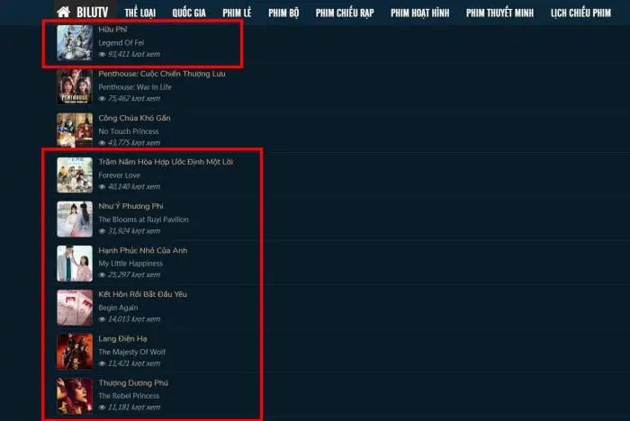 在越南的视频网站BiluTV和FPT Play上,国产剧几乎占据半壁江山。在BiluTV实时排名表上,国产剧占据过半席位,包括《有翡》《百岁之好,一言为定》《如意芳霏》《狼殿下》《上阳赋》等剧目,其余为韩剧和越南本土剧。