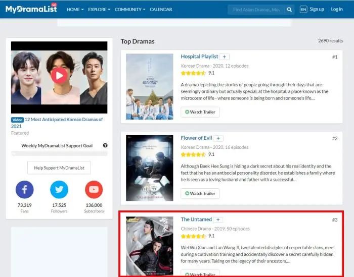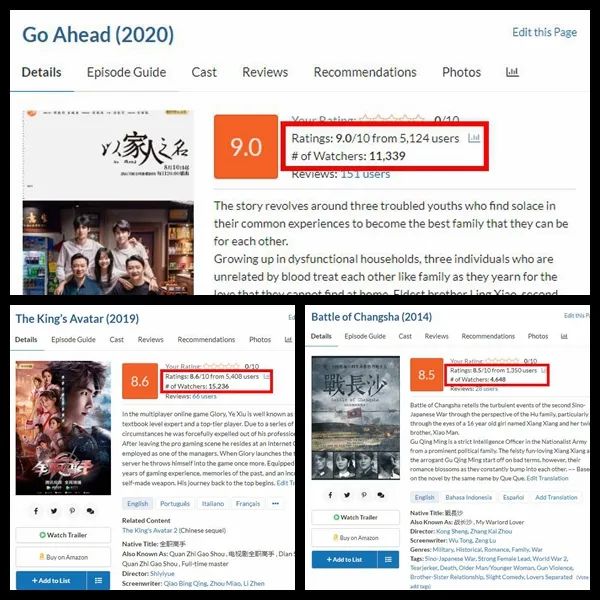 在MyDramaList的热门剧目中,除了《陈情令》《琅琊榜》等古装剧,还有《以家人之名》《全职高手》《我只喜欢你》《亲爱的,热爱的》《战长沙》等家庭、电竞、爱情以及战争题材的作品。