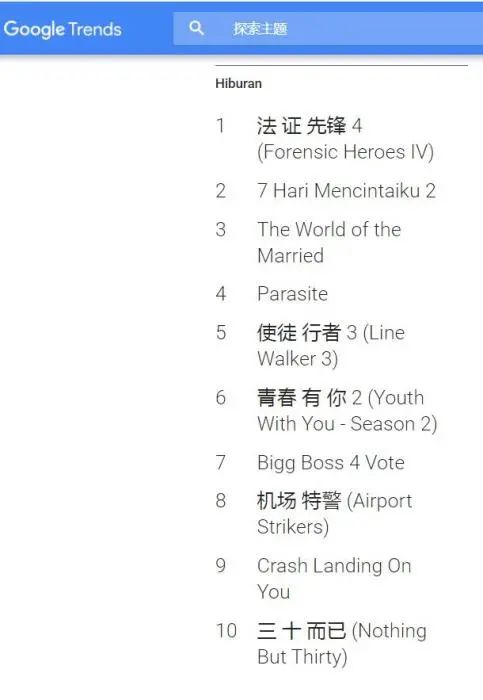 根据谷歌搜索数据分析,在2020年马来西亚的影视方面热搜词TOP10中,除了《法证先锋4》《使徒行者3》《机场特警》,还有大热的《青春有你2》以及《三十而已》。2019年还有《亲爱的,热爱的》和《全职高手》。